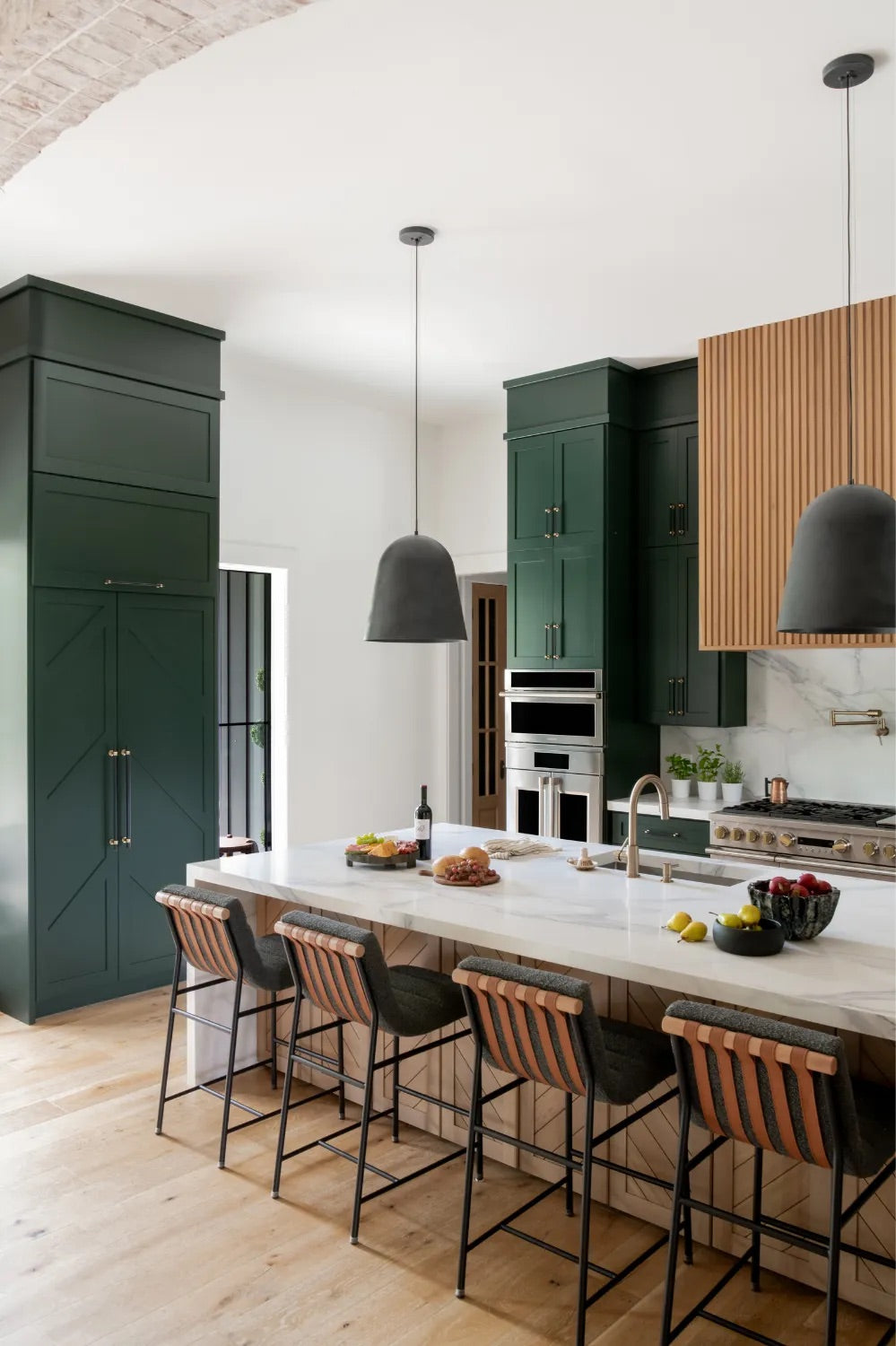 This Vernon Hills kitchen remodel blends luxury and function with Legend semi-custom cabinetry in Glacier and Granite, mitered Calacatta Miraggio quartz, a custom pantry, and a statement hood. Designed and...