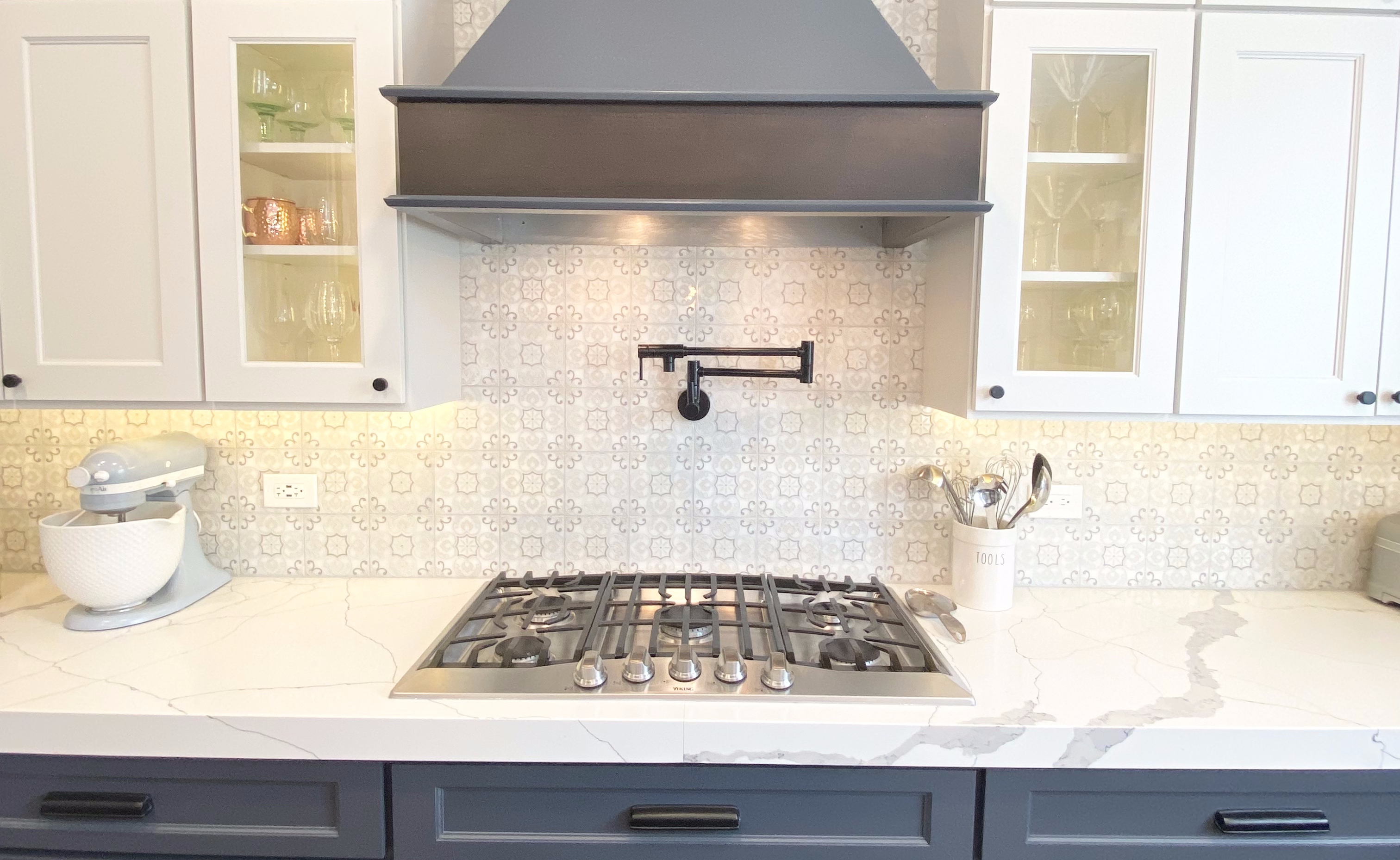 This Vernon Hills kitchen remodel blends luxury and function with Legend semi-custom cabinetry in Glacier and Granite, mitered Calacatta Miraggio quartz, a custom pantry, and a statement hood. Designed and...